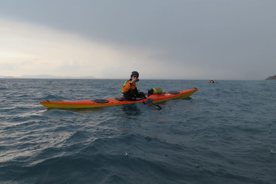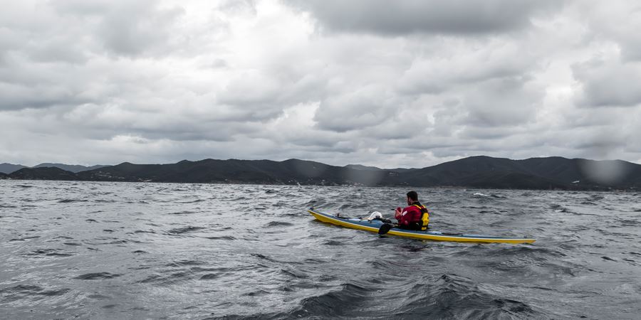 Bild: Da das Wetter alles andere als Beständig ist, beschließen wir am dritten Tag, Kasalla zu geben und die Inselumrundung abzuschließen. Nach knapp 40 Kllometern folgt das große Finale. Die letzten 1,5 Kilometer bis zurück nach Cavo sind stürmisch. Zwei Meter hohe Wellen und Strakwind von vorne lassen uns fast auf der Zielgeraden scheitern.