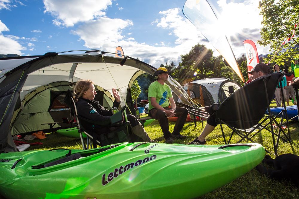 Bei meist grandiosem Wetter stehen die drei Pfingsttage komplett im Zeichen von Chillen, Talken, Paddeln. Ganz nebenbei können aktuelle Materialien getestet werden, auch Christian und Nadja waren für ihre Kanuschule und für Lettmann vor Ort.