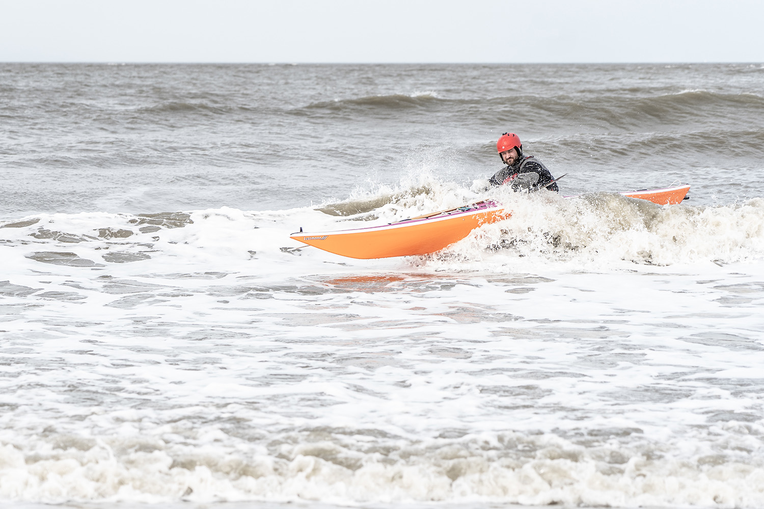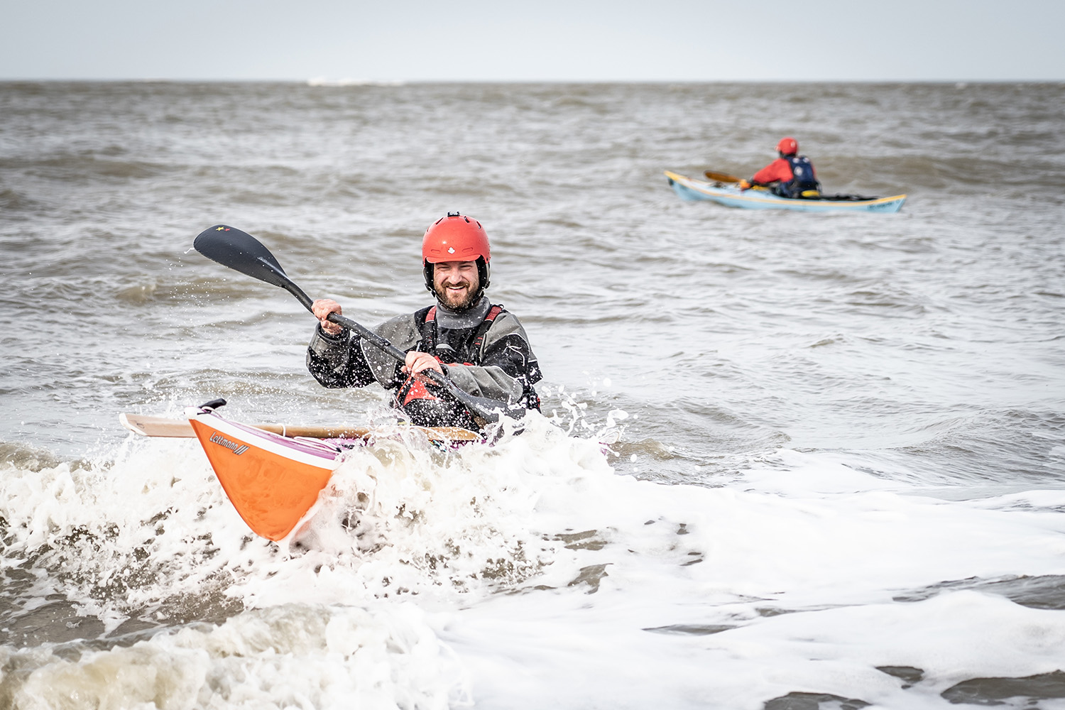 Völlig unbeeindruckt von Wind und Welle kommt das Skeg nur zu Testzwecken ins Wasser. Ich brauche es schlicht nicht. Das ist sicher auch meinem Gewicht von rund siebenundachtzig Kilo geschuldet, mit dem ich mich an der oberen Grenze des Adria MV befinde. Doch trotz Gepäck fühlt sich die Kleine nicht überladen an. Der gute Geradeauslauf, der sich später auch bei Seitenwind und Welle von Achtern bestätigt, hängt aber sicherlich mit dem recht weit hinten platzierten Cockpit zusammen. Ein leicht hecklastiger Trimm sorgt im Umkehrschluss zwar immer für ein schlechteres Sprintverhalten, da der Bug unter Vollgas mehr steigt, doch finde ich diesen Punkt bei einem Tourenseekajak zu vernachlässigen. Die Reisegeschwindigkeit, die ich mit der Adria locker paddeln kann, reicht mir völlig aus.