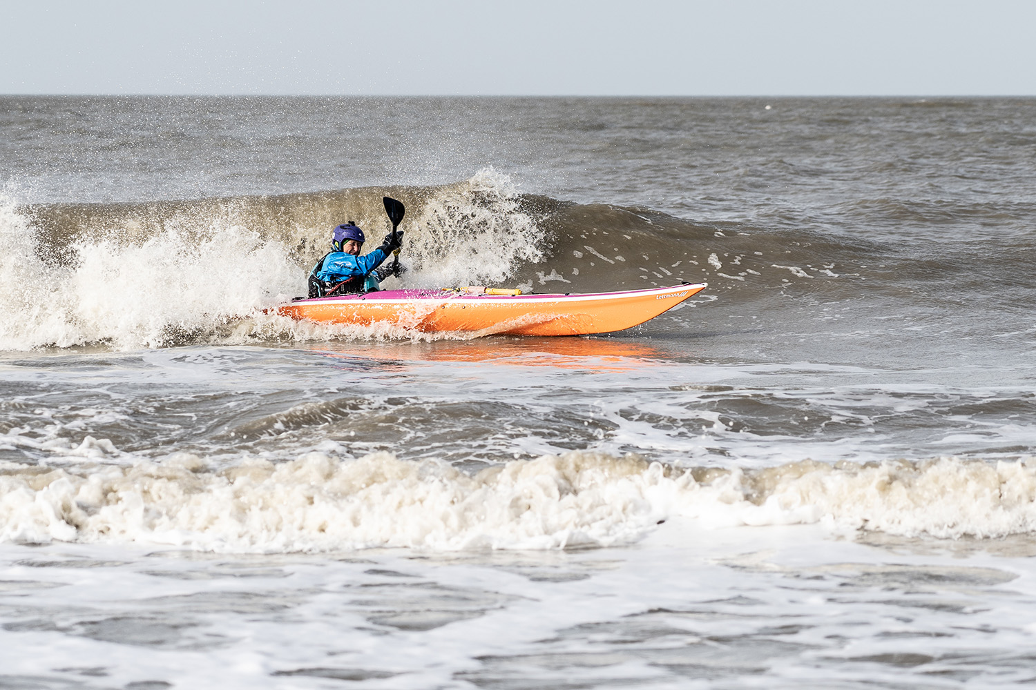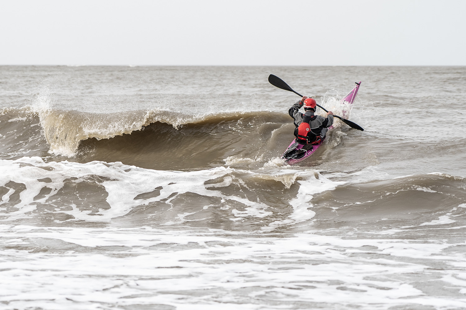 Wir erreichen die Nordseite von Baltrum. Uns steht eine alte See entgegen, die es in sich hat. Bei Wellen bis zu zwei Metern Höhe merkt man, dass das nicht allen aus der Gruppe ganz geheuer ist. Vor allem die Kandidaten mit ihren knapp über fünfzig Zentimeter breiten Kajak fangen ordentlich das Zappeln an. Das habe ich ja eh noch nie verstanden. Als hauptberuflicher Paddler merke ja sogar ich den Unterschied in der Stabilität zwischen einem zwei Zentimeter breiteren oder schmaleren Kajak - das eine fährt sich bei gleichem Unterschiffdesign einfacher und ruhiger als das Andere. In dem einen fühlt man sich wohler, in dem Anderen weniger. Warum dann fortgeschrittene Einsteiger solche Kippelkarren fahren müssen, erschließt sich mir nur schwer. Im Adria hingegen kann mich nichts aus der Ruhe bringen. Die 58 Zentimeter Breite sorgen für ein absolut sicheres Gefühl, welches sich auch bei späteren Bergemanövern bestätigt. Auch das Rollen in der Brandung gelingt mit der Adria leicht, allerdings ist dies bei einem Seekajak grundsätzlich kein Problem, sie rollen mit ihren schmalen Spanten eigentlich alle besser als jedes moderne Wildwasserkajak.